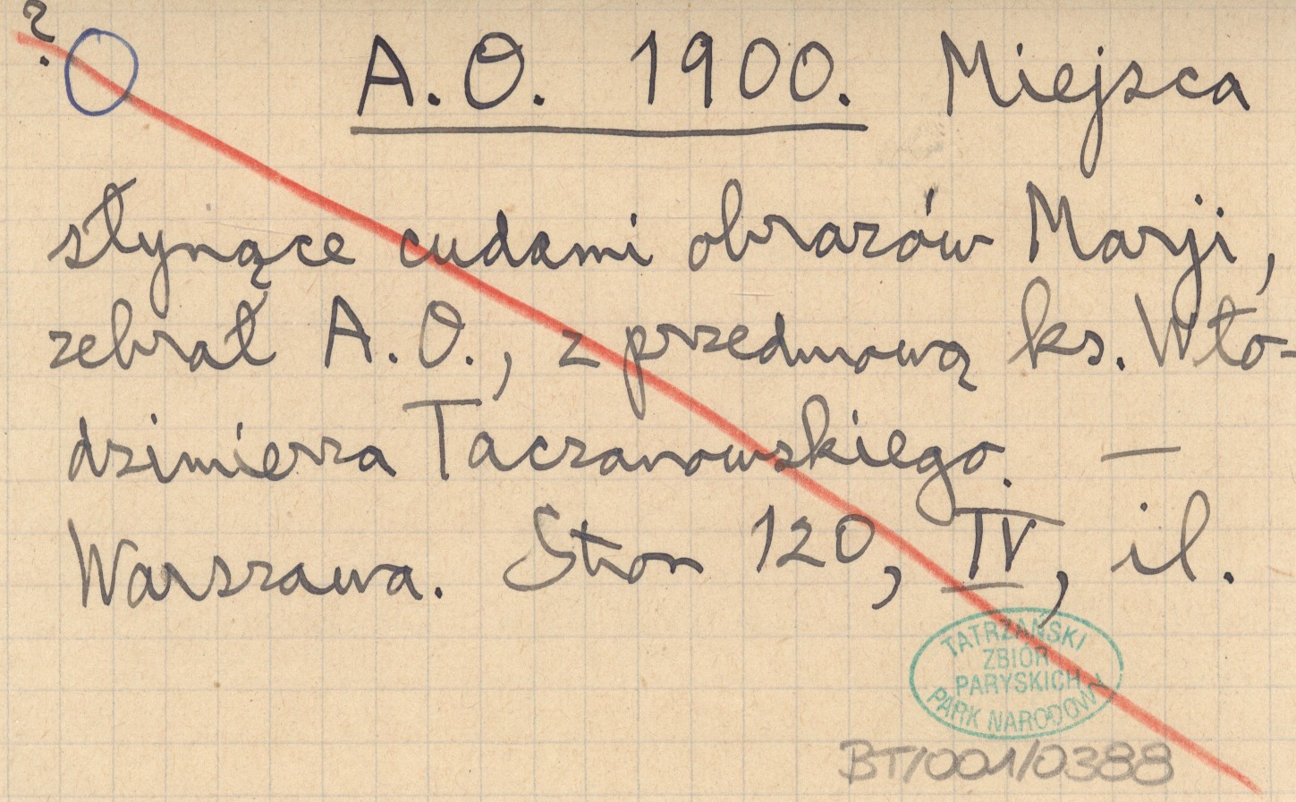 A. O. 1900 Miejsca słynące cudami obrazów Marji, zebrał A. O., z przedmową ks. Włodzimierza Taczanowskiego.