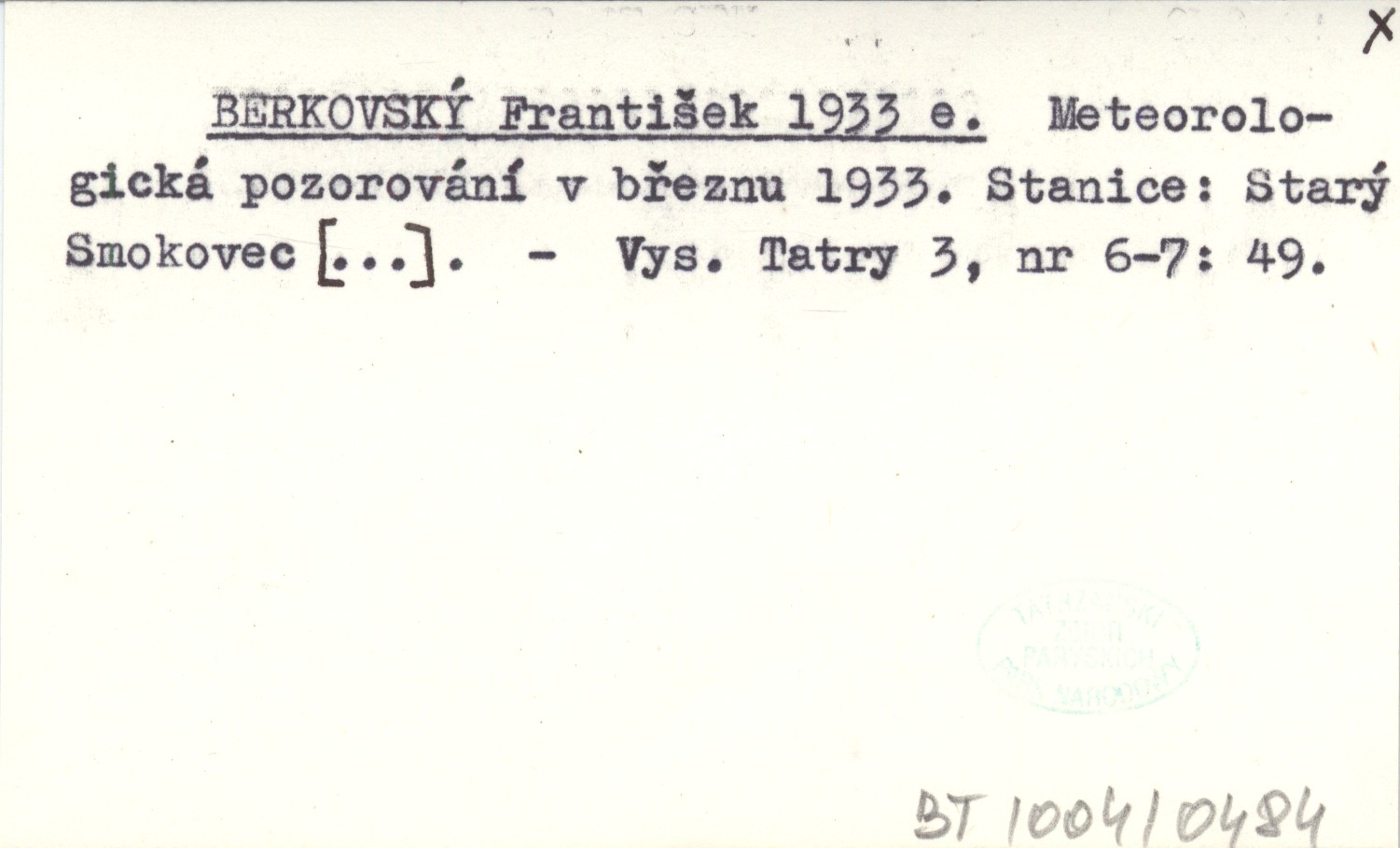 BERKOVSKÝ František 1933 e Meteorologická pozorování v březnu 1933. Stanice: Starý Smokovec [...].