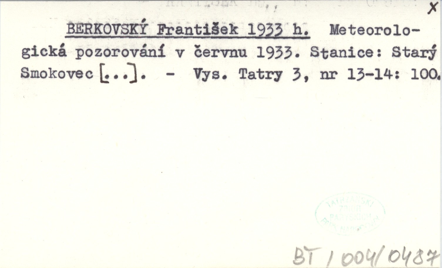 BERKOVSKÝ František 1933 h Meteorologická pozorování v červnu 1933. Stanice: Starý Smokovec [...].