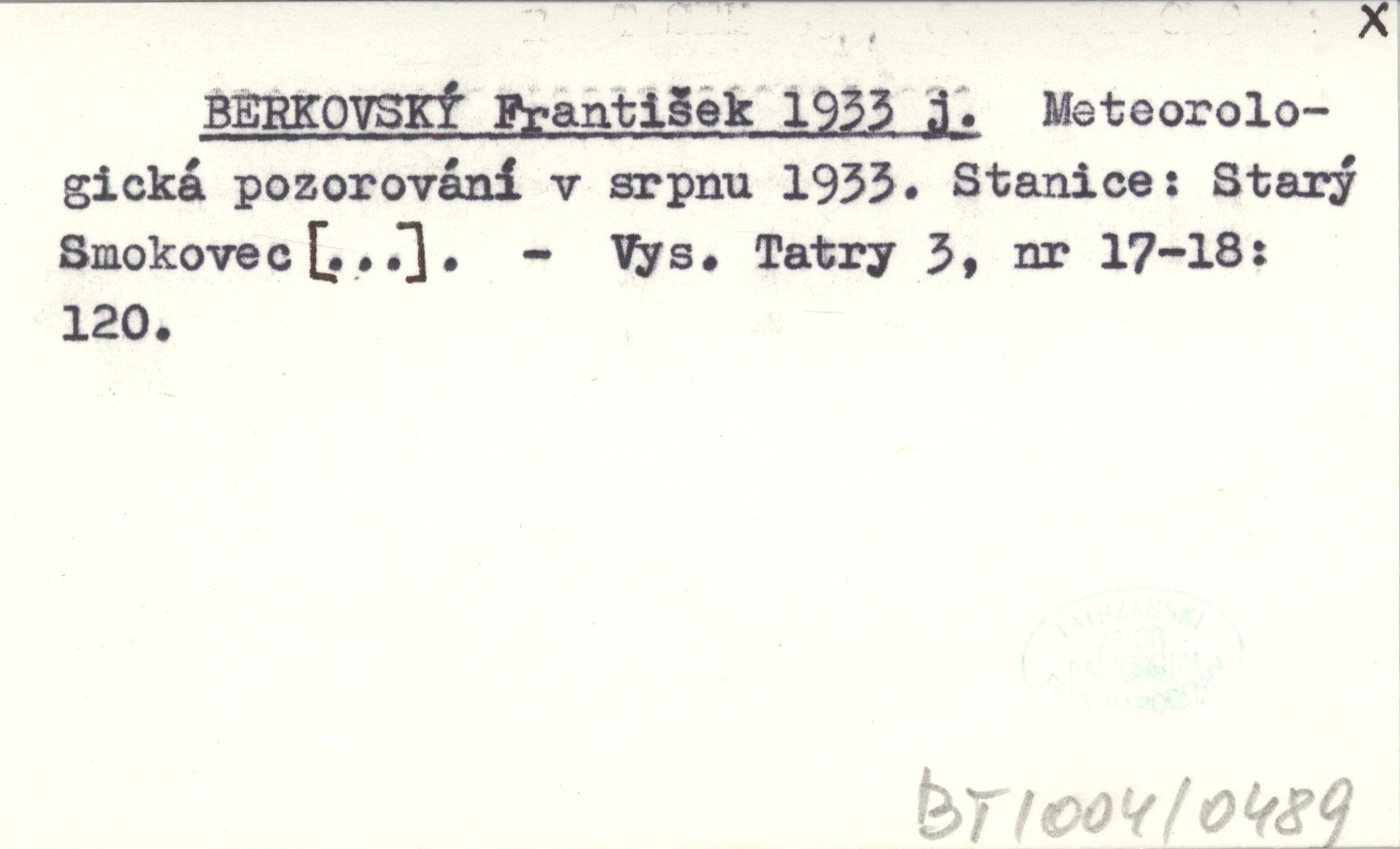 BERKOVSKÝ František 1933 j Meteorologická pozorování v srpnu 1933. Stanice: Starý Smokovec [...].