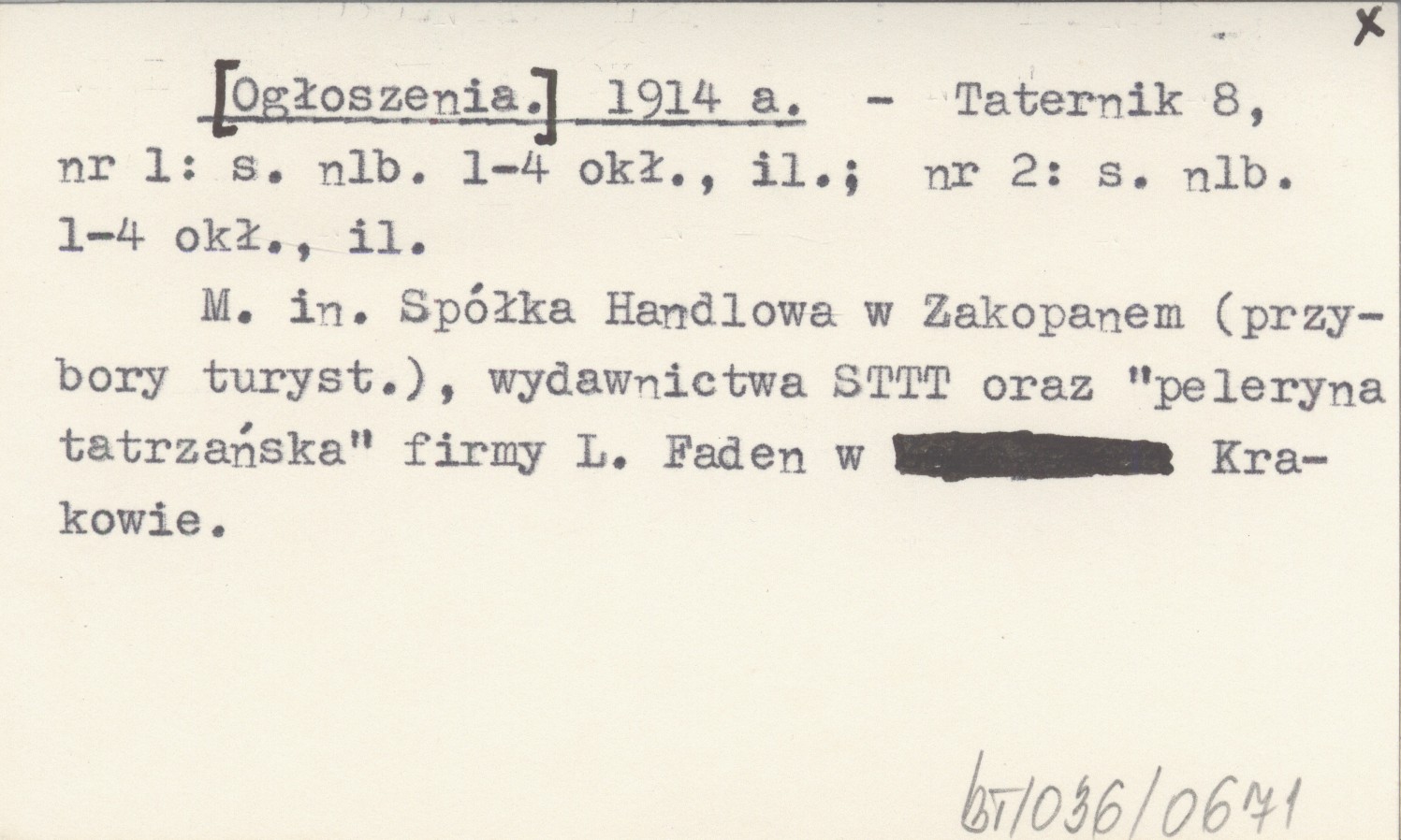 Taternik, 8, nr 1: [1-4] (okł.), il.; nr 2: [1-4] (okł.), il. M. in. Spółka Handlowa w Zakopanem (przybory turystyczne), wydawnictwa STTT oraz "peleryna tatrzańska" firmy L. Faden w Krakowie.