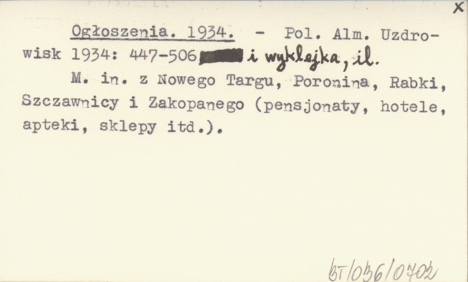 Polski Almanach Uzdrowisk, 1934: 447-506, wykl., il. M. in. z Nowego Targu, Poronina, Rabki, Szczawnicy i Zakopanego (pensjonaty, hotele, apteki, sklepy itd.).