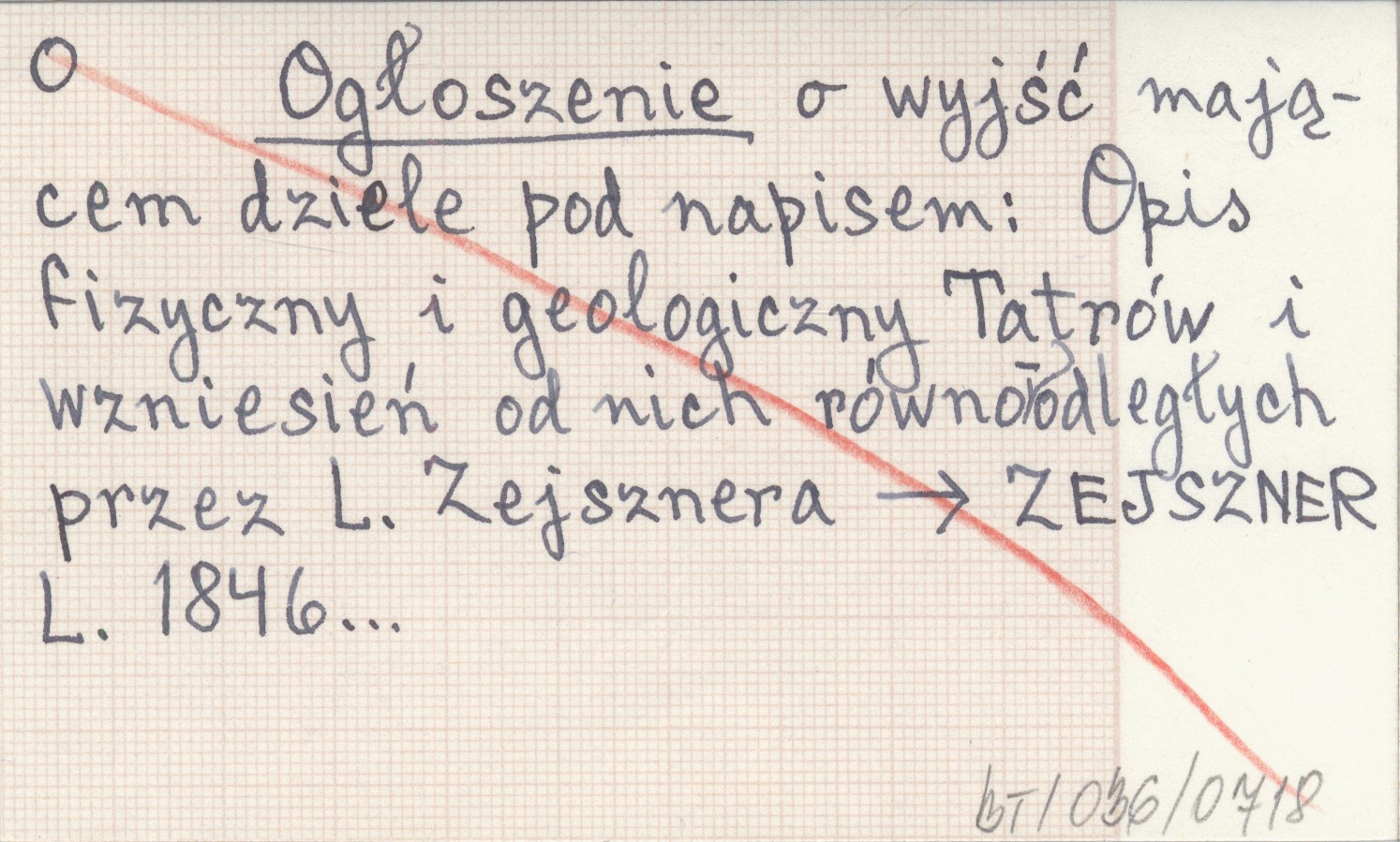 Ogłoszenie o wyjść mającem dziele pod napisem: Opis fizyczny i geologiczny Tatrów i wzniesień od nich równoległych przez L. Zejsznera