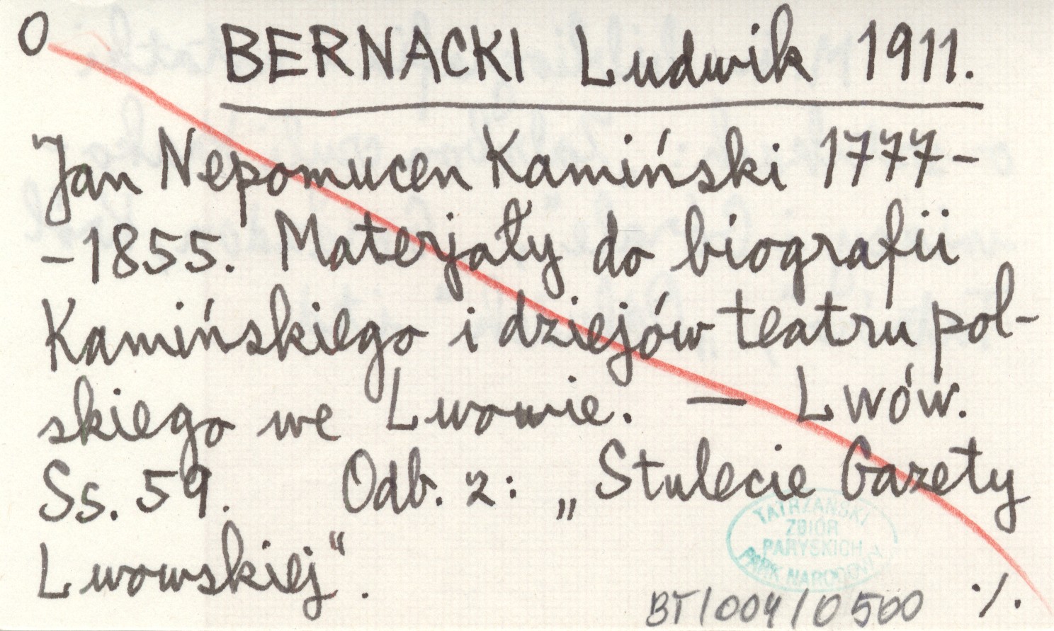 BERNACKI Ludwik 1911 Jan Nepomucen Kamiński 1777-1855. Materjały do bibliografii Kamińskiego i dziejów teatru polskiego we Lwowie.