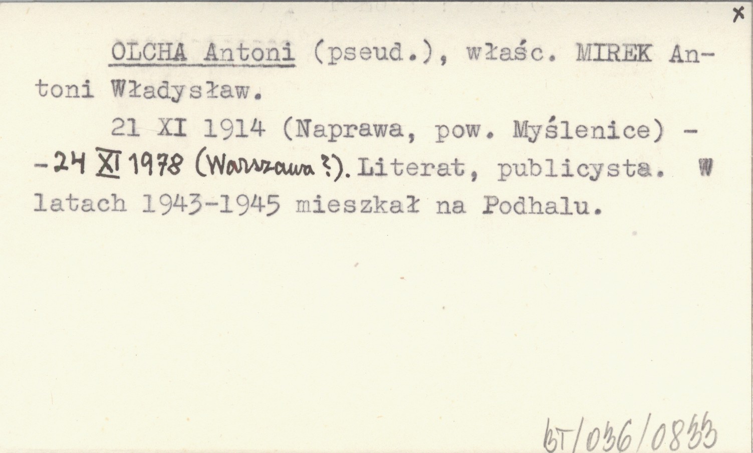 21 XI 1914 (Naprawa, pow. Myślenice) - 24 XI 1978 (Warszawa?). Literat, publicysta. W latach 1943-1945 mieszkał na Podhalu.