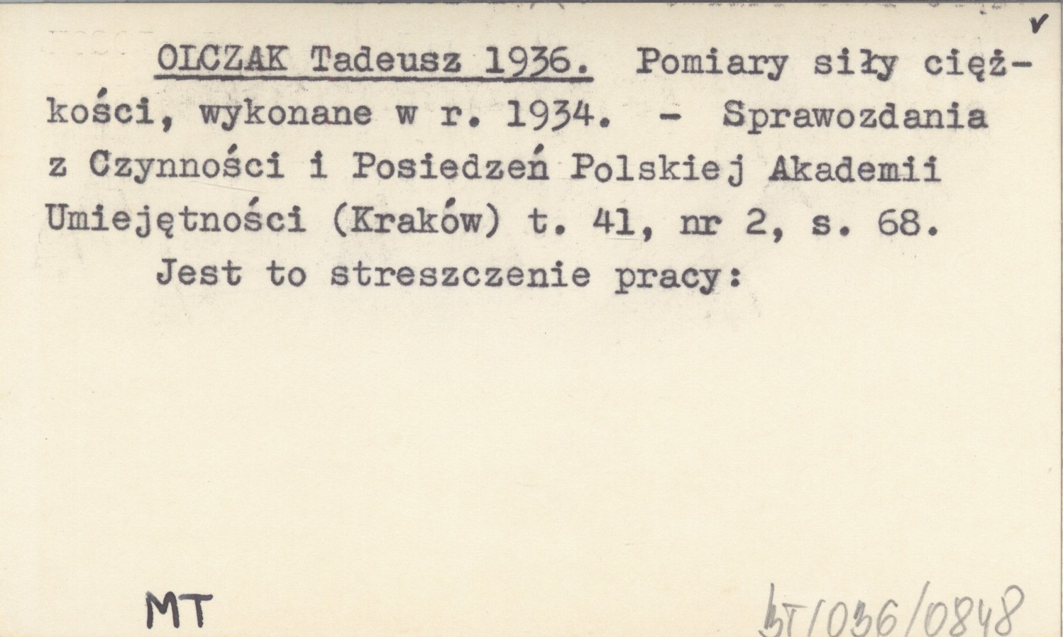 OLCZAK Tadeusz 1936 Pomiary siły ciężkości, wykonane w r. 1934.
