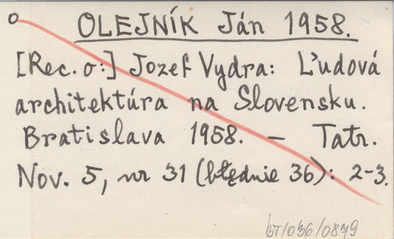 OLEJNÍK Ján 1958 Jozef Vydra: Ľudová architektúra na Slovensku. Bratislava 1958.