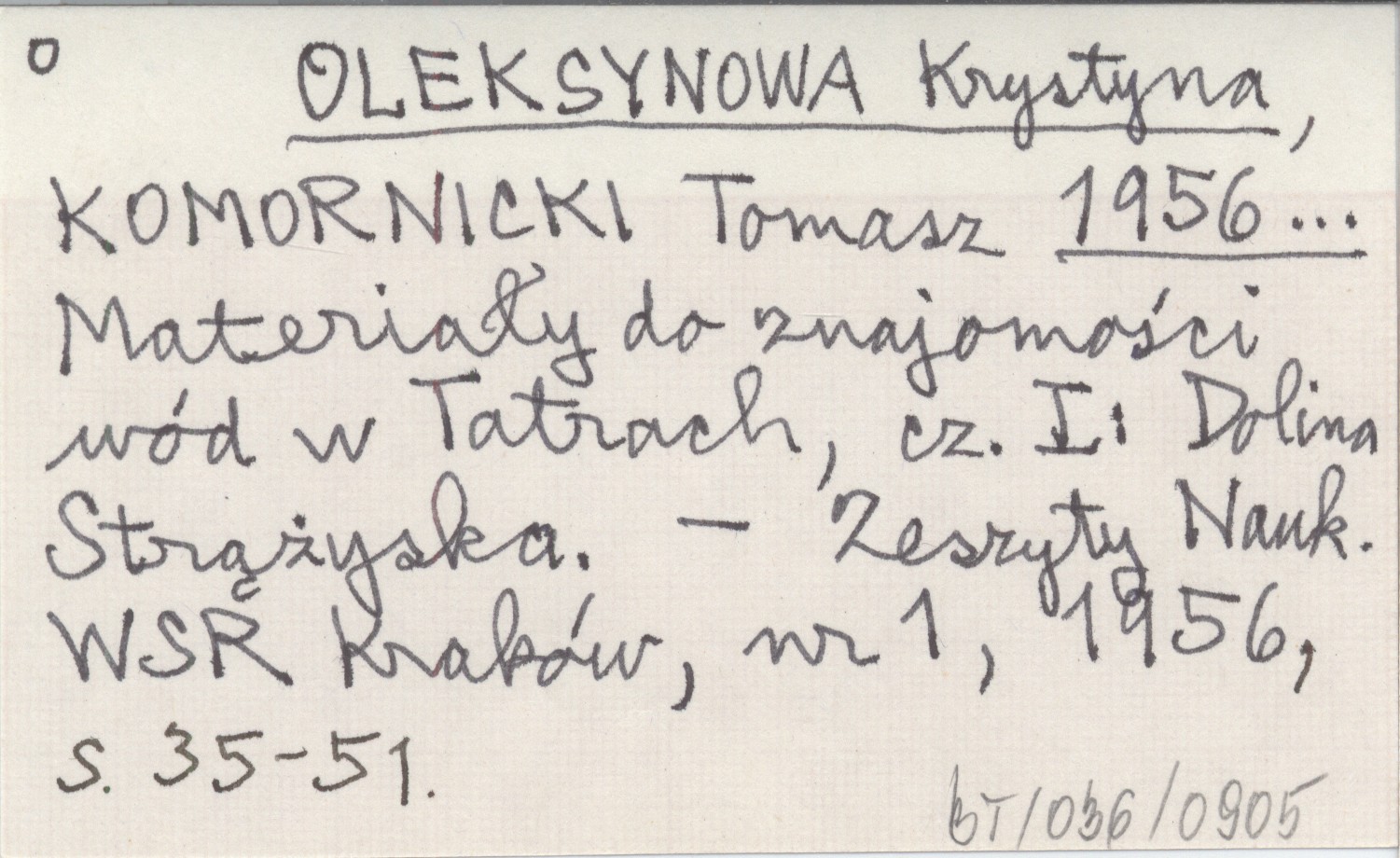 OLEKSYNOWA Krystyna KOMORNICKI, Tomasz. ; 1956... Materiały do znajomości wód w Tatrach, cz. I: Dolina Strążyska.