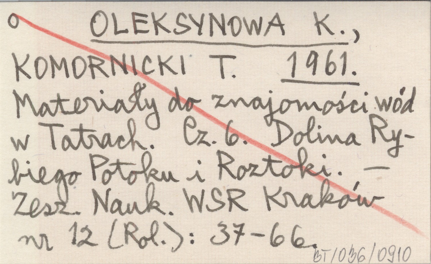 OLEKSYNOWA K. KOMORNICKI, T. ; 1961 Materiały do znajomości wód w Tatrach. Cz. 6. Dolina Rybiego Potoku i Roztoki.