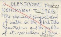 OLEKSYNOWA Krystyna KOMORNICKI, Tomasz. ; 1965 The chemical composition of water in the Polish Tatra Mountains and the problem of its variation in time.