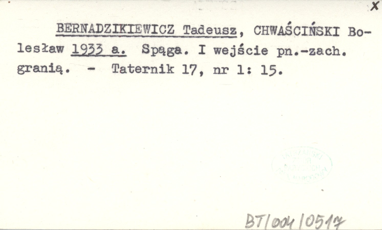 BERNADZIKIEWICZ Tadeusz CHWAŚCIŃSKI, Bolesław. ; 1933 a Spąga. I wejście pn.-zach. granią.