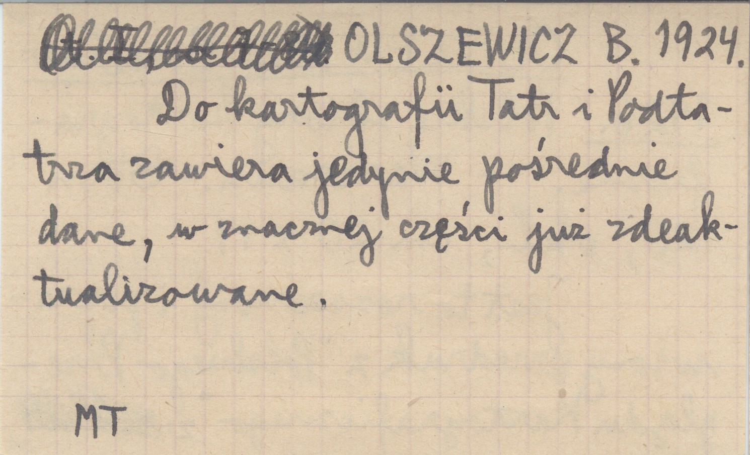 Warszawa , 120 s., okł., 20x14 cm. Do kartografii Tatr i Podtatrza zawiera jedynie pośrednie dane, w znacznej części już zdezaktualizowane. Jest to rozszerzony i poprawiony przedruk z "Polskiego Przeglądu Kartograficznego" z: OLSZEWICZ B. 1924. OLSZEWICZ B. 1924