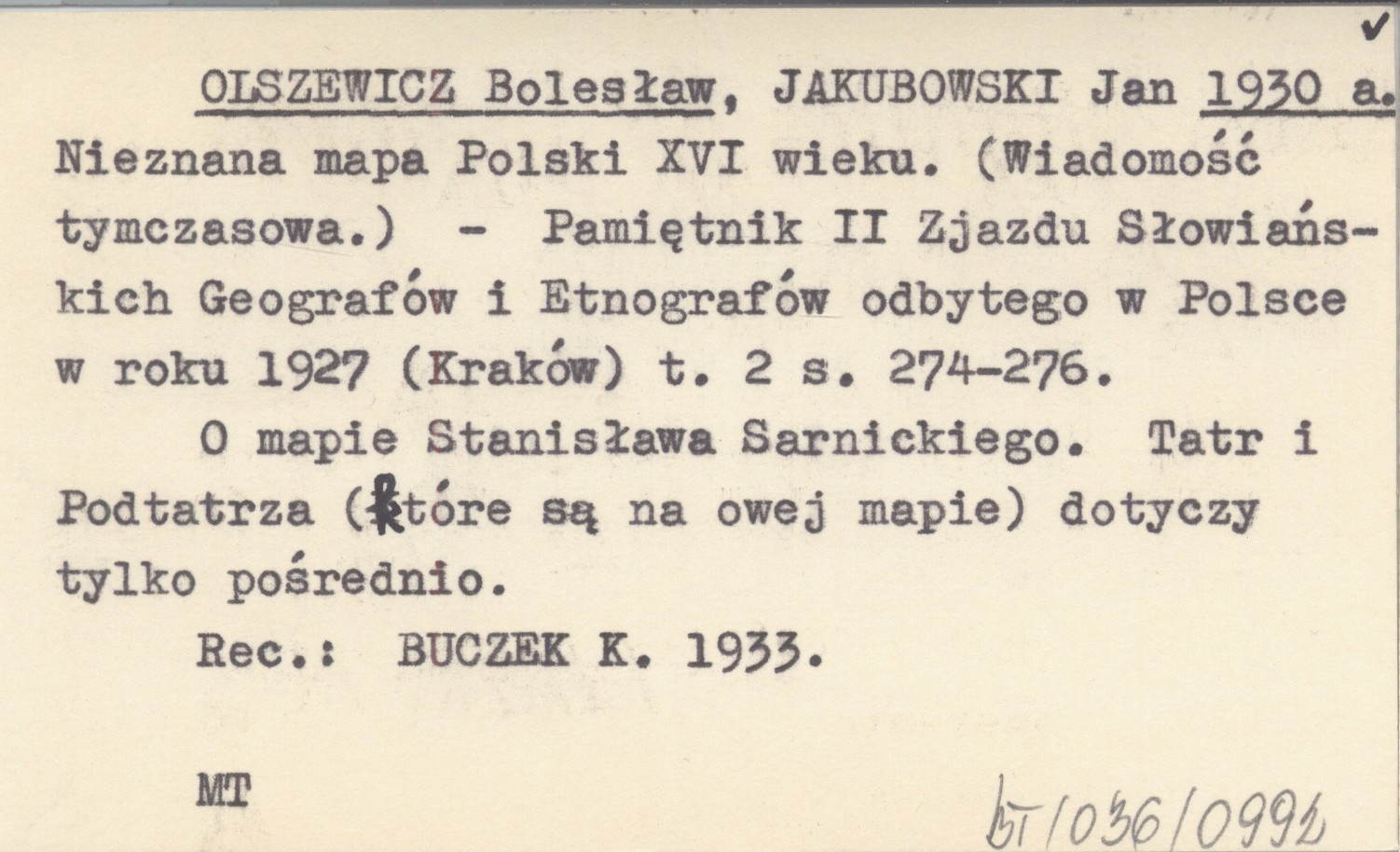 OLSZEWICZ Bolesław JAKUBOWSKI, Jan. ; 1930 a Nieznana mapa Polski XVI wieku. (Wiadomość tymczasowa).