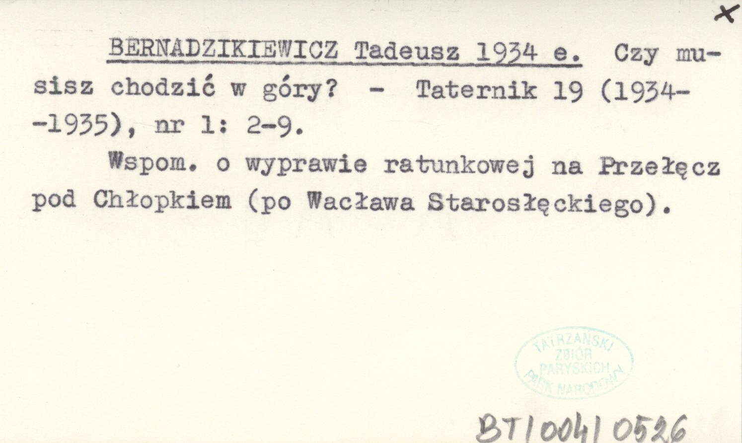 Taternik, 19 (1934-1935), nr 1: 2-9. Wspom. o wyprawie ratunkowej na Przełęcz pod Chłopkiem (po Wacława Starosłęckiego).