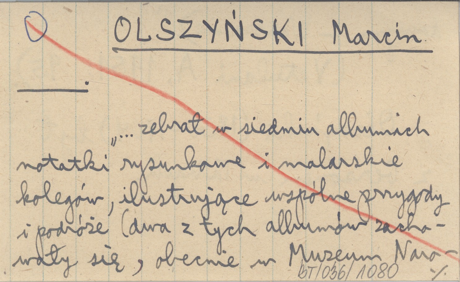 OLSZYŃSKI Marcin "... zebrał w siedmiu albumach notatki rysunkowe i malarskie kolegów, ilustrujące wspólne przygody i podróże (dwa z tych albumów zachowały się, obecnie w Muzeum Narodowym w Warszawie)".