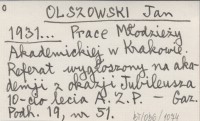 OLSZOWSKI Jan 1931... Prace Młodzieży Akademickiej w Krakowie. Referat wygłoszony na akademji z okazji Jubileusza 10-cio lecia A. Z. P.