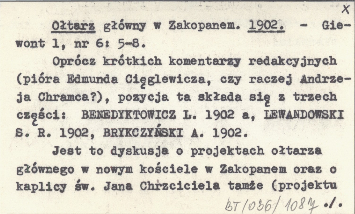 Giewont, 1, nr 6: 5-8. Jest to dyskusja o projektach ołtarza głównego w nowym kościele w Zakopanem oraz o kaplicy św. Jana Chrzciciela tamże (projektu Stanisław Witkiewicza) i w ogóle o stylu zakopiańskim. Oprócz krótkich komentarzy redakcyjnych )pióra Edmunda Cięglewicza, czy raczej Andrzeja Chramca?), pozycja ta składa się z trzech części. BENEDYKTOWICZ L. 1902 a, LEWANDOWSKI S. R. 1902, BRYKCZYŃSKI A. 1902.