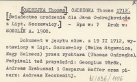 ONDREGKA Thomas [ONDREJKA Thomas] 1712 [¦wiadectwo urodzenia dla Jana Onfrejkovicľa z Lipt. Szczawnicy].