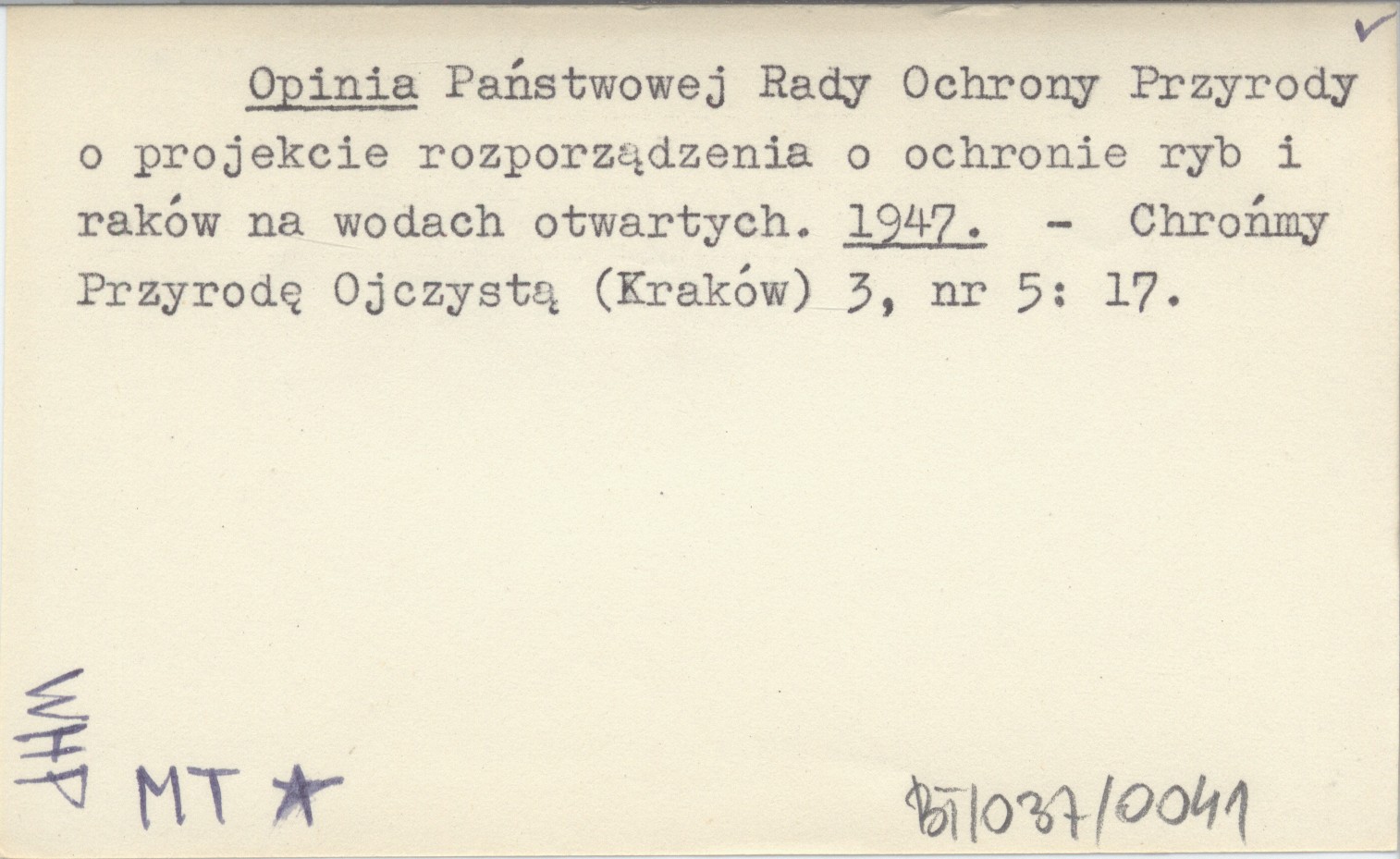 Opinia Państwowej Rady Ochrony Przyrody o projekcie rozporządzenia o ochronie ryb i raków na wodach otwartych. 1947