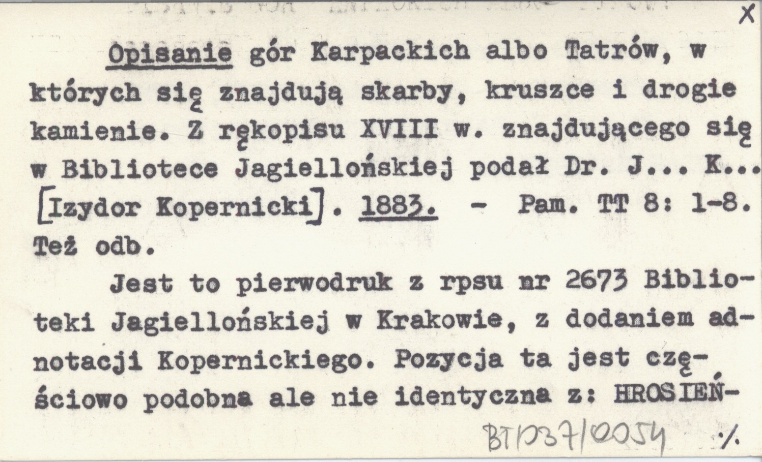 Opisanie gót Karpackich albo Tatrów, w których się znajdują skarby, kruszce i drogie kamienie. Z rękopisu XVIII w. znajdującego się w Bibliotece Jagiellońskiej podał Dr. J... K... [Izydor Kopernicki]. 1883