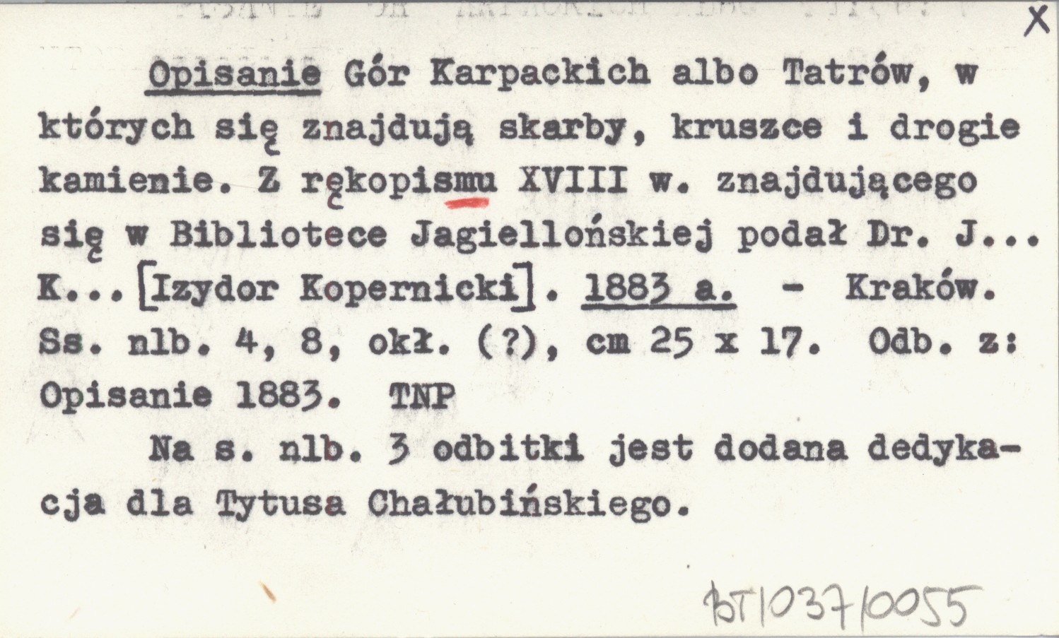 Opisanie Gór Karpackich albo Tatrów, w których się znajdują skarby, kruszce i drogie kamienie. Z rękopismu XVIII w. znajdującego się w Bibliotece Jagiellońskiej podał Dr. J... K... [Izydor Kopernicki]. 1883 a