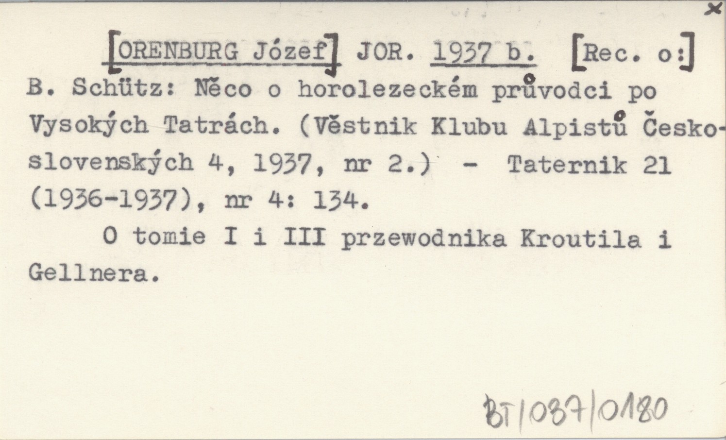 JOR. [ORENBURG Józef] 1937 b B. Schütz: Nìco o horolezeckém prùvodci po Vysokęch Tatrách. (Vìstnik Klubu Alpinistù Èeskoslovenskęch 4, 1937, nr 2).
