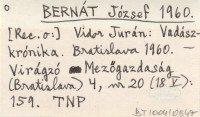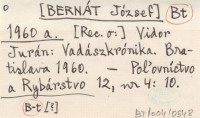 Bt [BERNÁT József] 1960 a Vidor Jurán: Vadászkrónika. Bratislava 1960.