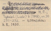 Warszawa , 193 s., 8°. Z przedmową Kazimierza Tetmajera. REC: Drogoszewski A., Biblioteka Warszawska (Warszawa) 1899, t. 3 (234): 570-572. H. C., Tydzień (Lwów) 6 (1898), nr 34: 271-272. ŁOPACIŃSKI H.R. 1900. Kraj (Petersburg), dod. Dział Ilustracyjny nr 27: 24. BADENI J. 1898.