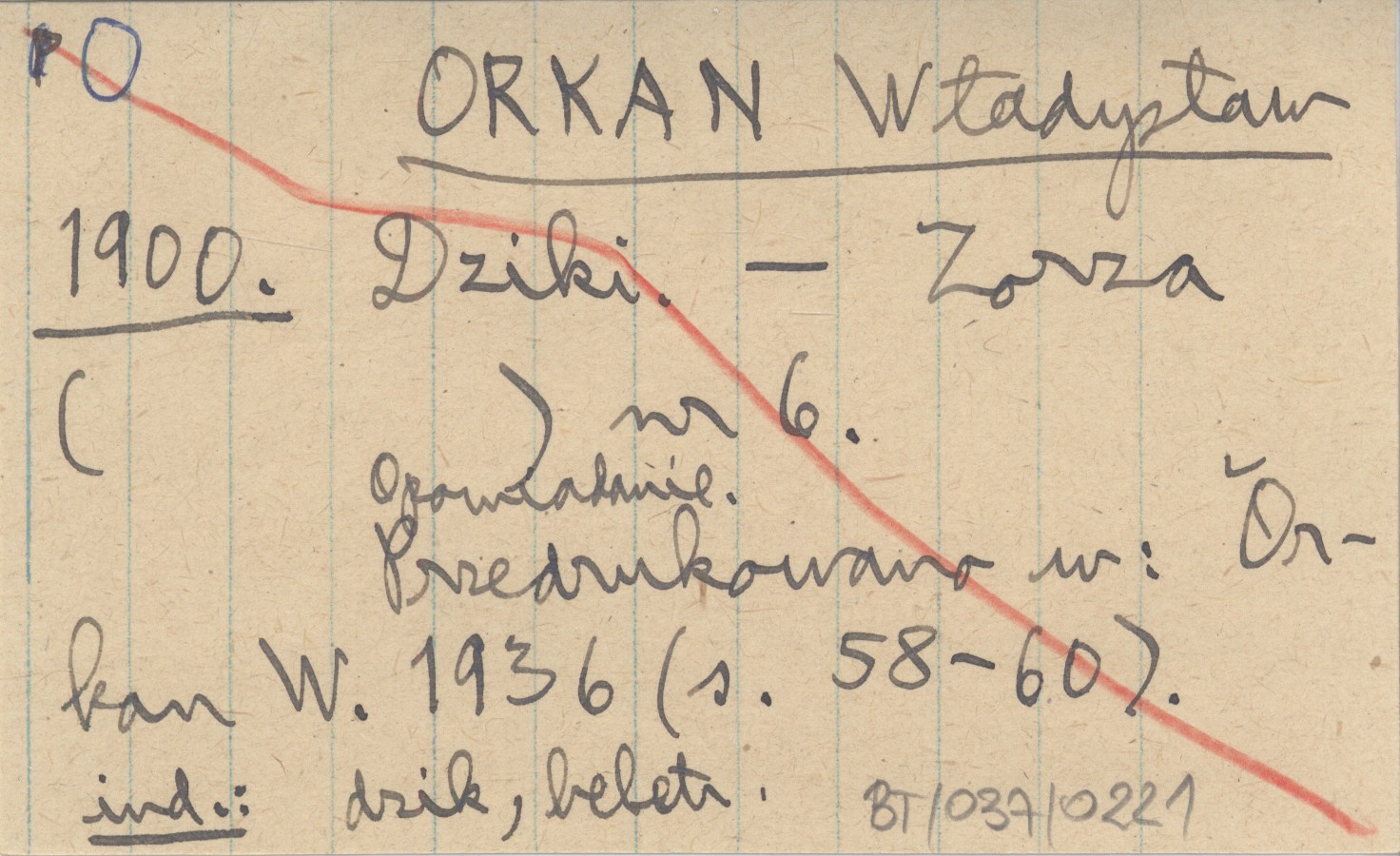 Zorza, Nr 6. dzik ; beletrystyka ; Opowiadanie. Przedrukowano w: Orkan W. 1936 (s. 58-60).