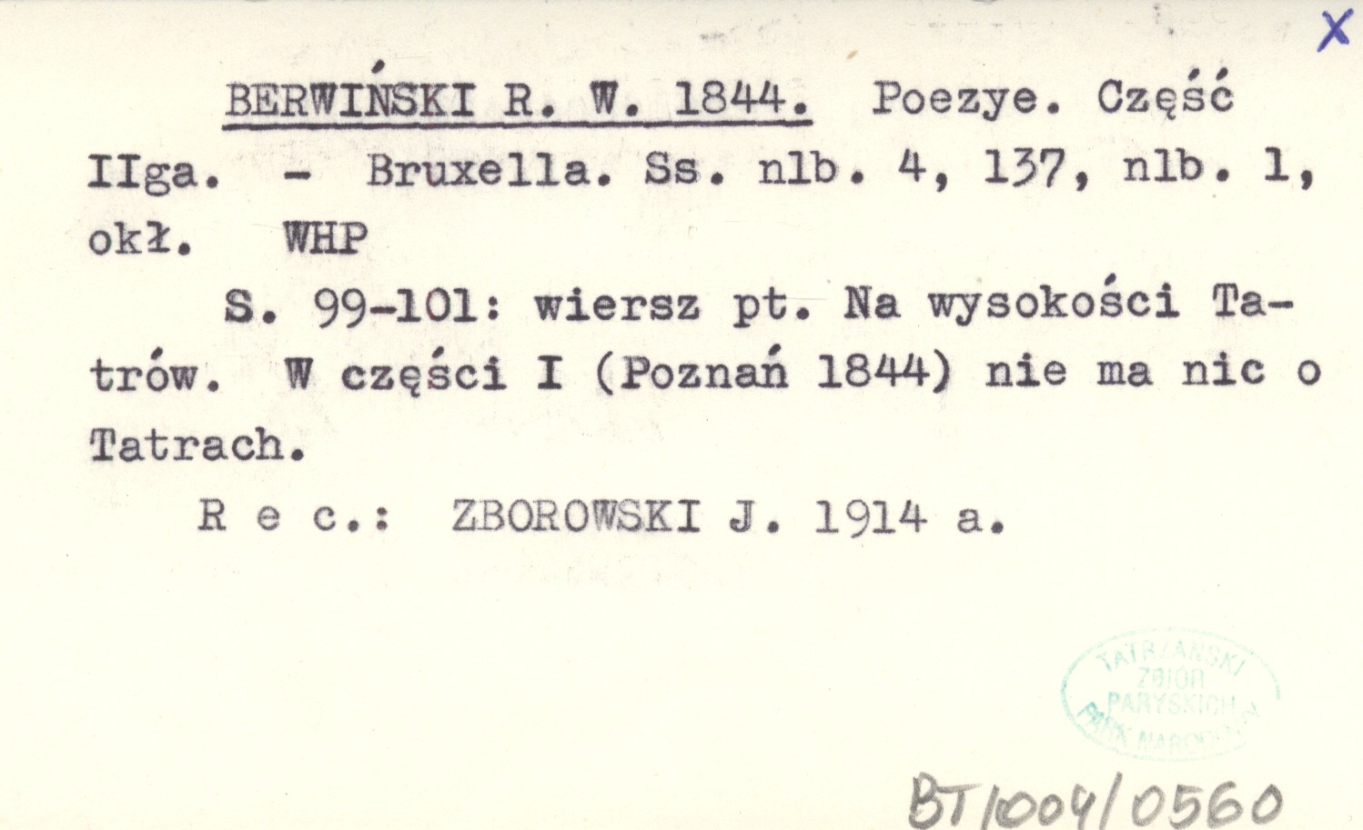 Bruxella , [4], 137, [1] s., okł. S. 99-101: wiersz pt. Na wysokości Tatrów. W części I (Poznań 1844) nie ma nic o Tatrach. REC: ZBOROWSKI J. 1914 a