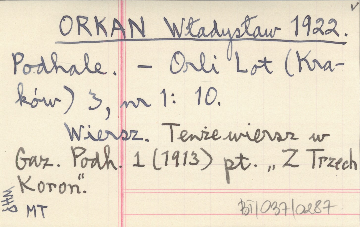 Orli Lot (Kraków) , 3, nr 1: 10. Wiersz. Tenże wiersz w Gazecie Podhalańskiej 1 (1913) pt. "Z Trzech Koron".
