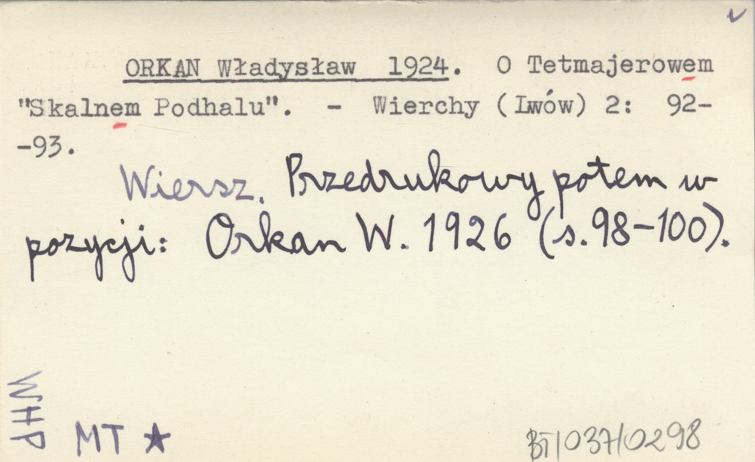 Wierchy (Lwów) , 2: 92-93. Wiersz. Przedrukowany potem w pozycji: Orkan W. 1926 (s. 98-100).