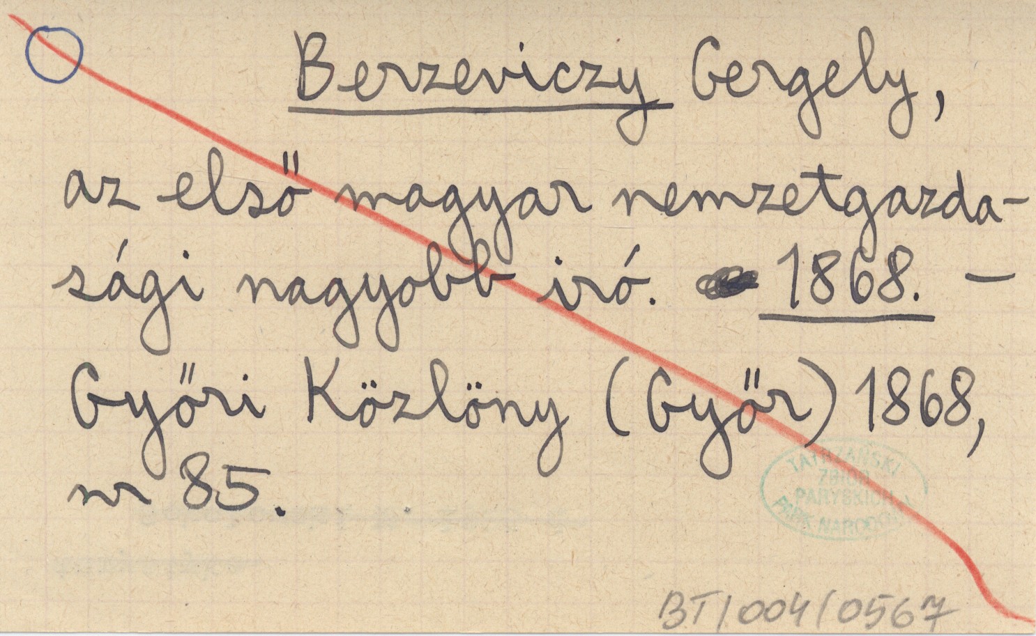 Berzeviczy 1868 Gergely, az elsö magyar nemzetgazdasági nagyobb iró.