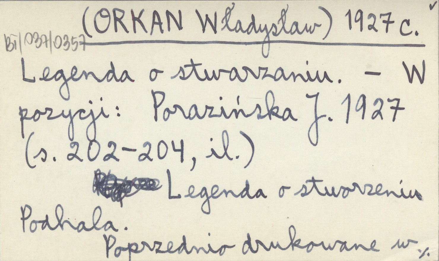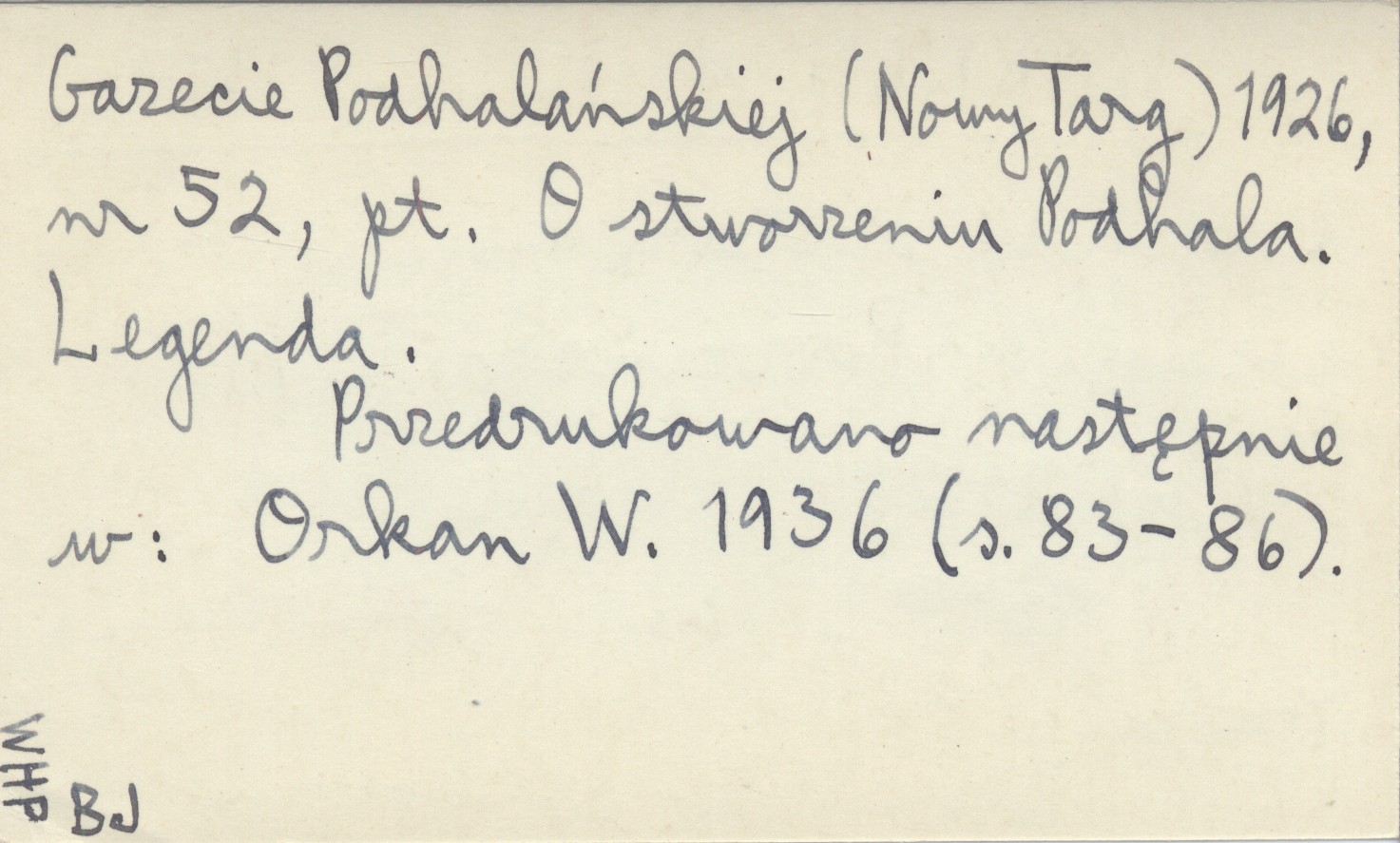 Porazińska J. 1927 (s. 202-204, il.). , Legenda o stworzeniu Podhala. Poprzednio drukowane w Gazecie Podhalańskiej (Nowy Targ) 1926, nr 52, pt. O stworzeniu Podhala. Legenda. Przedrukowano następnie w: Orkan W. 1936 (s. 83-86).