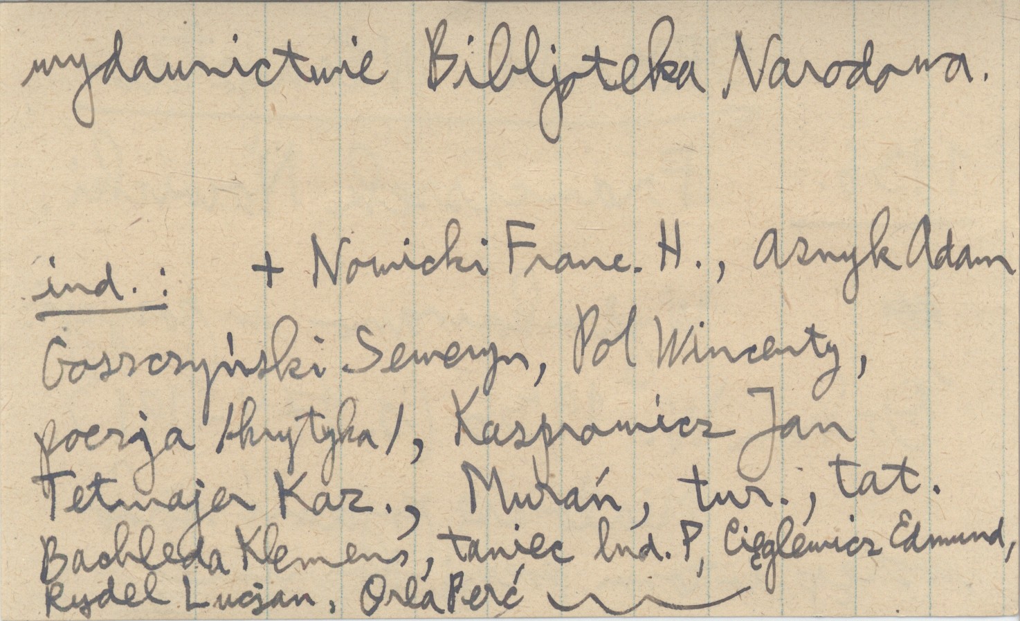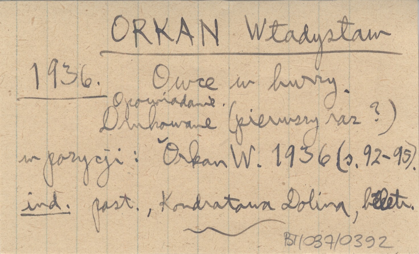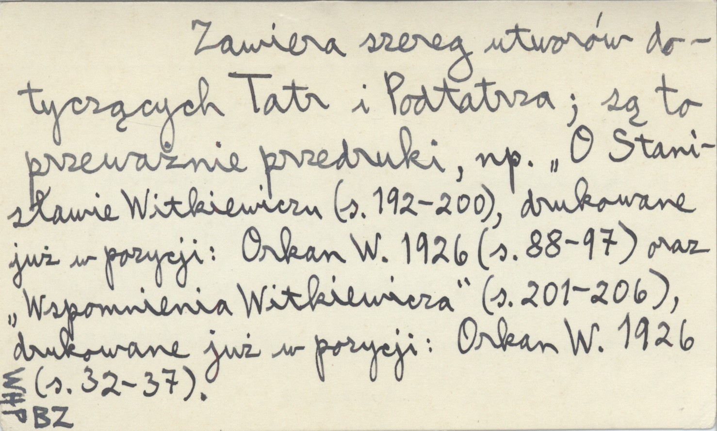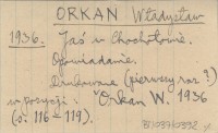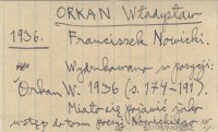 Warszawa , 298, [5] s., okł., 12x18 cm. Nowicki, Franciszek H. ; Asnyk, Adam. ; Goszczyński, Seweryn. ; Pol, Wincenty. ; Kasprowicz, Jan. ; Tetmajer, Kazimierz. ; Bachleda, Klemens. ; Cięglewicz, Edmund. ; Rydel, Lucjan. ; poezja ; krytyka ; turystyka ; taternictwo ; taniec ludowy ; Chochołowskie Powstanie ; śpiące wojsko ; pasterstwo ; beletrystyka ; Murań ; Orla Perć. ; Chochołów ; Kondratowa Dolina ; Jako jeden z tomów Dzieł Władysława Orkana pod redakcją Stanisława Pigonia. Zawiera szereg utworów dotyczących Tatr i Podtatrza; są to przeważnie przedruki, np. "O Stanisławie Witkiewiczu (s. 192-200), drukowane już w pozycji: Orkan W. 1926 (s. 88-97) oraz "Wspomnienia Witkiewicza" (s. 201-206), drukowane już w pozycji: Orkan W. 1926 (s. 32-37). 1. i 3. drukowane już w r. 1902 i 1909. Razem wszystko (z powyższym tytułem i podtytułami) wydrukowano w pozycji Orkan W. 1936 (s. 221-229). Franciszek Nowicki (wydrukowano w pozycji: Orkan W. 1936: 174-191; miało się pojawić jako wstęp do tomu poezyj Nowickiego w wydawnictwie Bibljoteka Narodowa). Jaś w Chochołowie(opowiadanie, drukowane [pierwszy raz?] w pozycji: Orkan W. 1936: 116-119). Owce w burzy (opowiadanie, drukowane [pierwszy raz?] w pozycji: Orkan W. 1936: 92-95).