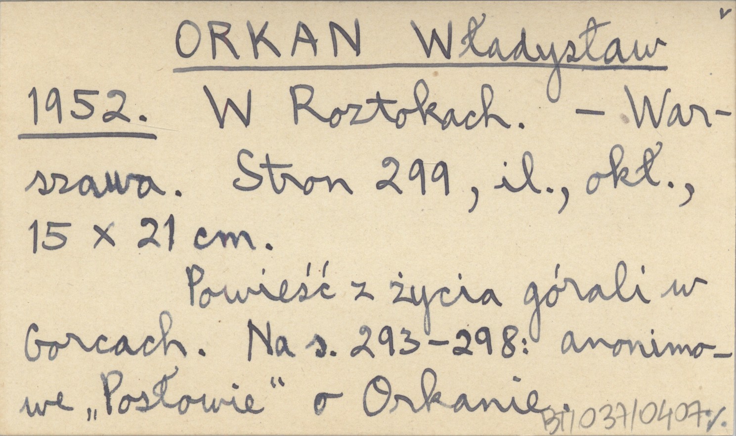Warszawa , 299 s., il., okł., 15x21 cm. Powieść z życia górali w Gorcach. Na s. 293-298: anonimowe "Posłowie" o Orkanie. Tatr dotyczą tylko wzmianki we wstępie autora (s. 5-7).