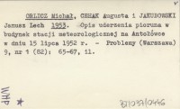 ORLICZ Michał CEHAK, Augusta. ; JAKUBOWSKI, Janusz Lech. ; 1953 Opis uderzenia pioruna w budynek stacji meteorologicznej na Antołówce w dniu 15 lipca 1952 r.