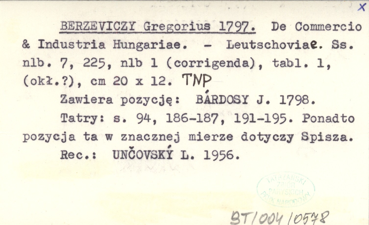 Leutschoviae , [7], 225, [1] s. (corrigenda), 1 k. tabl., (okł.?), 20x12 cm. Zawiera pozycję: BÁRDOSY J. 1798. Tatry: s. 94, 186-187, 191-195. Ponadto pozycja ta w znacznej mierze dotyczy Spisza. REC: UNČOVSKÝ L. 1956