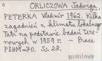 ORLICZOWA Jadwiga PETERKA, Vladimír. ; 1962 Kilka zagadnień z klimatu lokalnego Tatr na podstawie badań terenowych w 1959r.