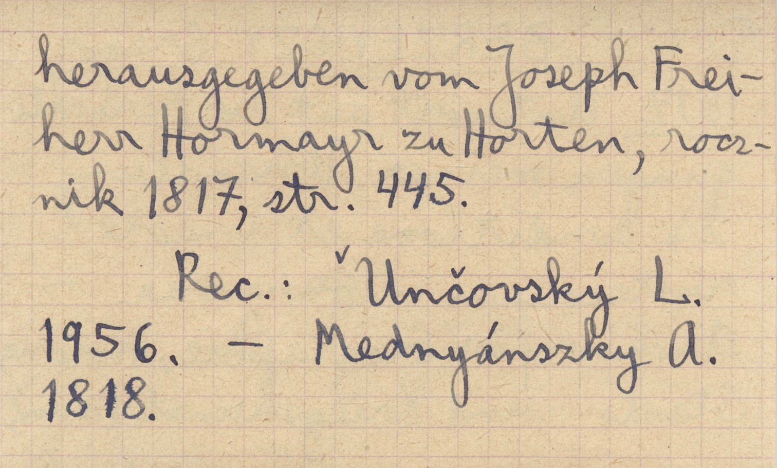 Archiv für Geographie Historie, Staats- und Kriegskunst (Wien), heausgegeben vom Joseph Freiherr Hormayr zu Horten, 445 s. REC: UNČOVSKÝ L. 1956 ; MEDNYÁNSZKY A. 1818 ;