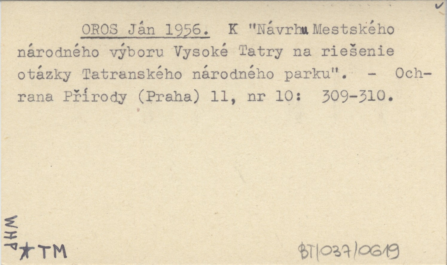 OROS Ján 1956 K "Návrhu Mestsk=ho národného výboru Vysoké Tatry na rieąenie otázky Tatranského národného parku".