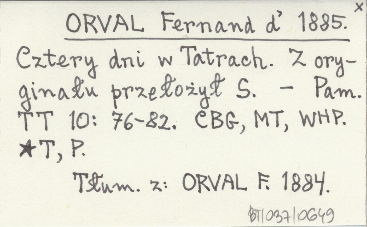 ORVAL Fernand d' 1885 Cztery dni w Tatrach. Z oryginału przełożył S.