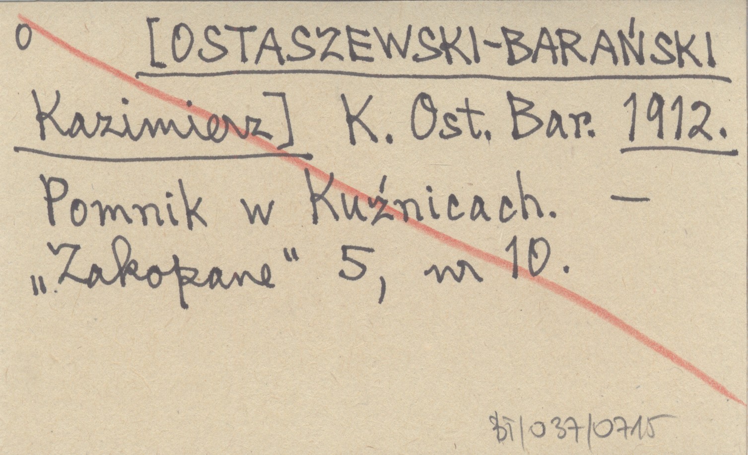 K. Ost. Bar. [OSTASZEWSKI-BARAŃSKI Kazimierz] 1912 Pomnik w Kuźnicach.