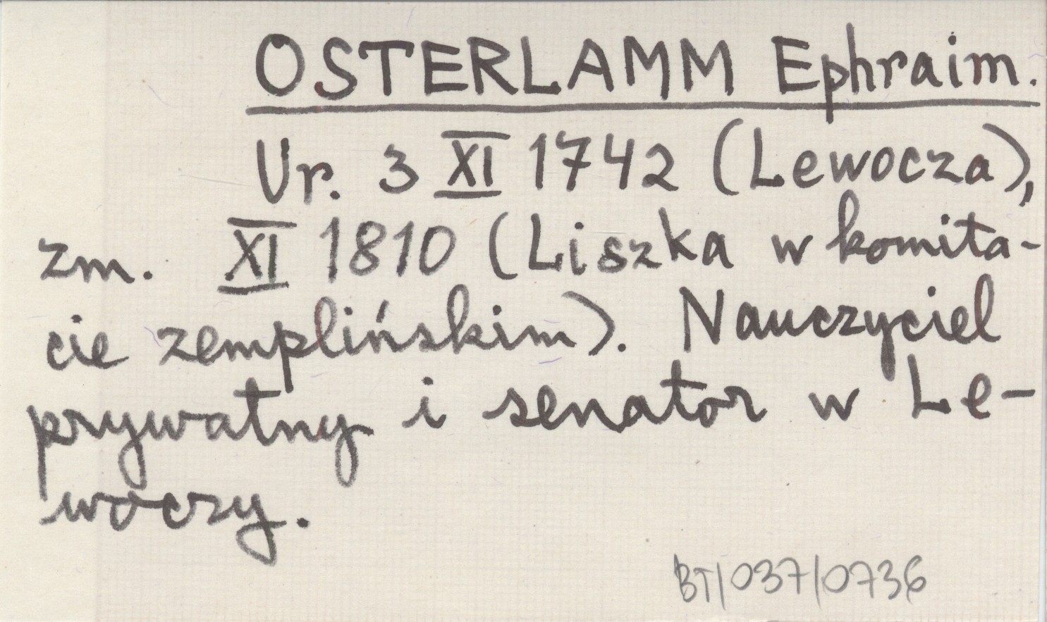 Ur. 3 XI 1742 (Lewocza), zm. XI 1810 (Liszka w komitacie zemplińskim). Nauczyciel prywatny i senator w Lewoczy.