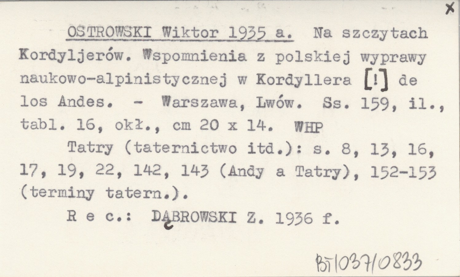 OSTROWSKI Wiktor 1935 a Na szczytach Kordyljerów. Wspomnienia z polskiej wyprawy naukowo-alpinistycznej w Kordyllera [!] de los Andes.