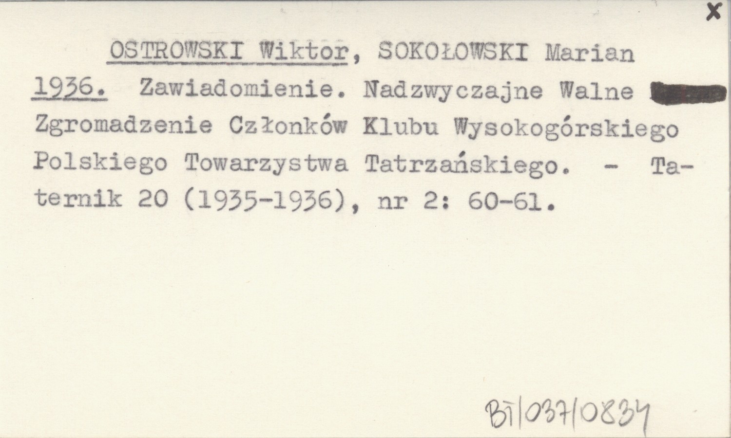 OSTROWSKI Wiktor SOKOŁOWSKI, Marian. ; 1936 Zawiadomienie. Nadzwyczajne Walne Zgromadzenie Członków Klubu Wysokogórskiego Polskiego Towarzystwa Tatrzańskiego.