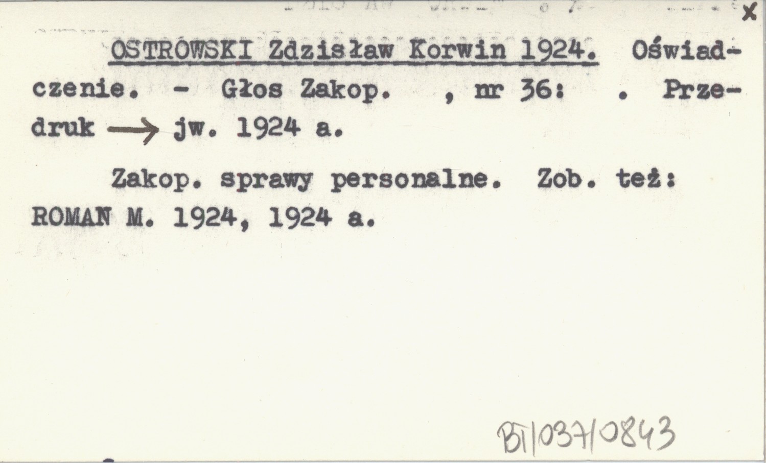 Głos Zakopiański, Nr 36. Zakopaińskie sprawy personalne. Przedruk: jw. 1924 a. Zob. też: ROMAN M. 1924, 1924 a. OSTROWSKI Zdzisław Korwin 1924 a ROMAN M. 1924, 1924 a