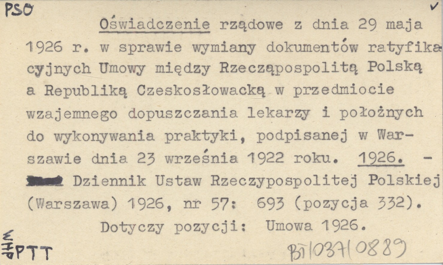 Oświadczenie rządowe z dnia 29 maja 1926 r. w sprawie wymiany dokumentów ratyfikacyjnych Umowy między Rzecząpospolitą Polską w Republiką Czechosłowacką w przedmiocie wzajemnego dopuszczania lekarzy i położnych do wykonywania praktyki, podpisanej w Warszawie dnia 23 września 1922 roku. 1926