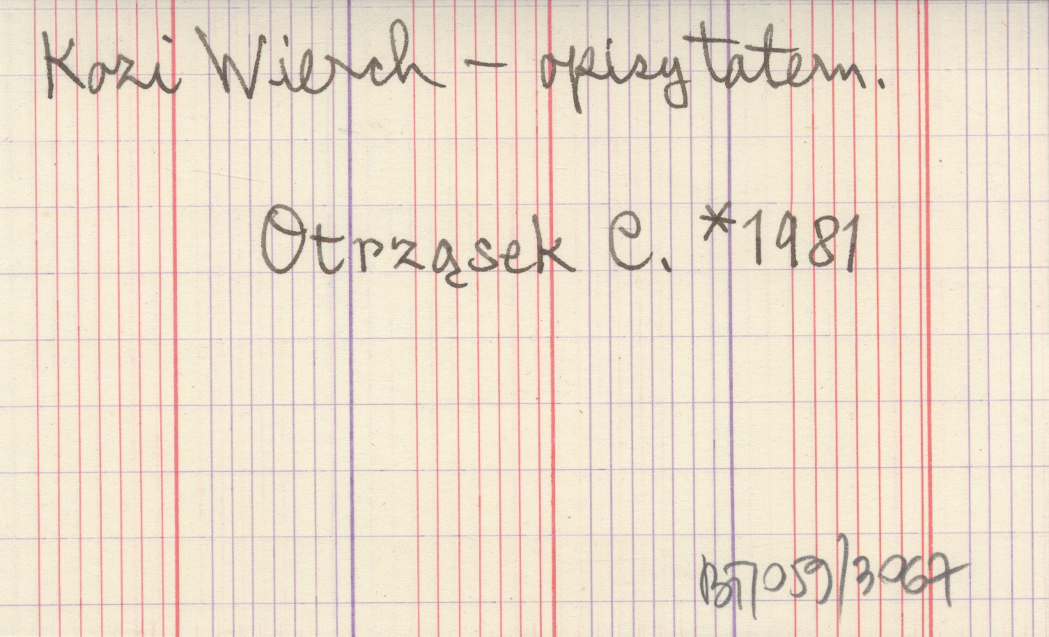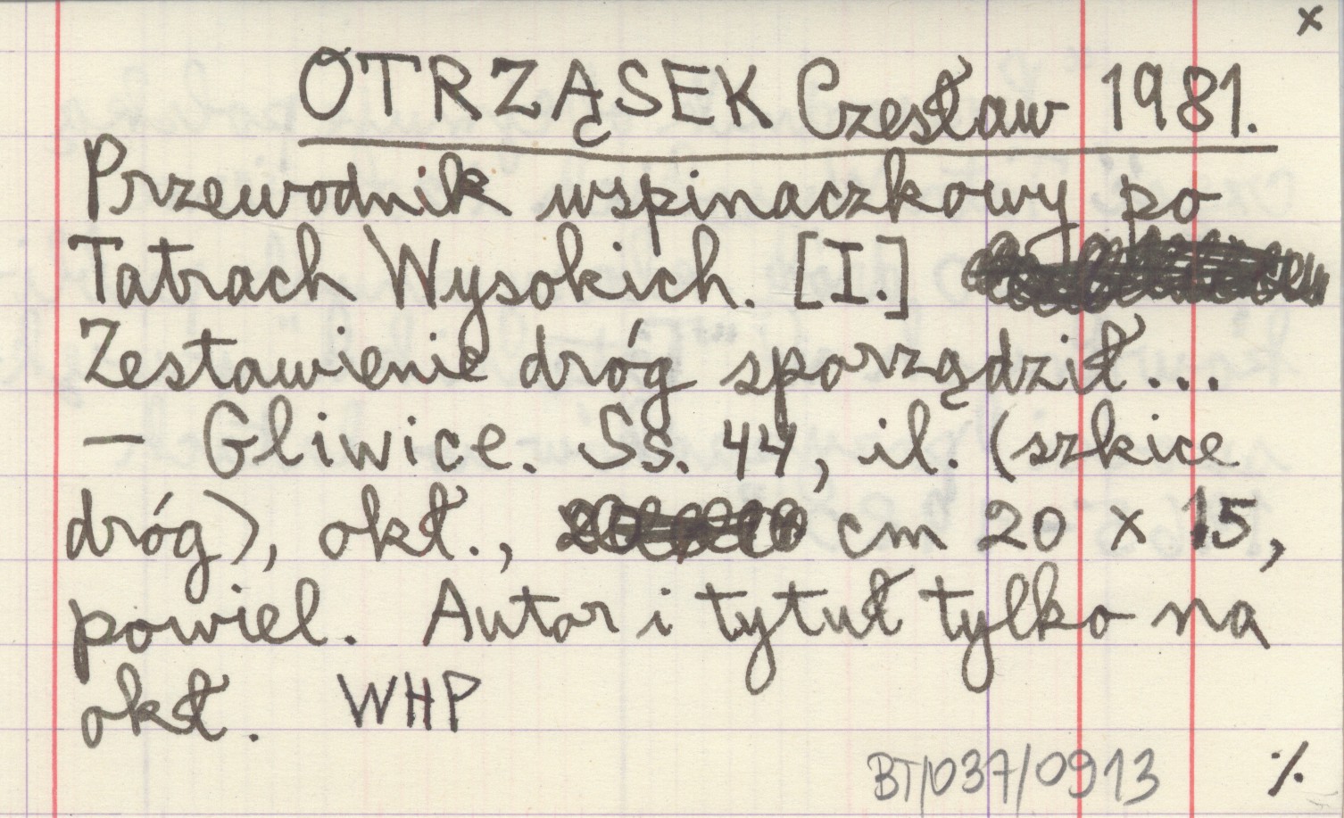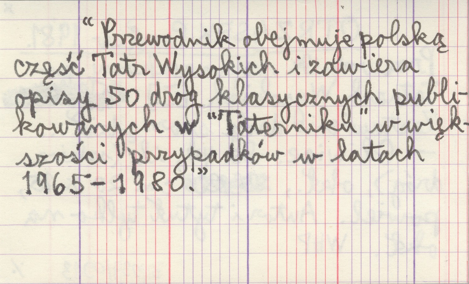 Gliwice , 44 s., il., okł., 20x15 cm, powiel. Ilustracje: szkice dróg. "Przewodnik obejmuje polską część Tatr Wysokich i zawiera opisy 50 dróg klasycznych publikowanych w "Taterniku" w większości przypadków w latach 1965-1980". Autor i tytuł tylko na okładce.