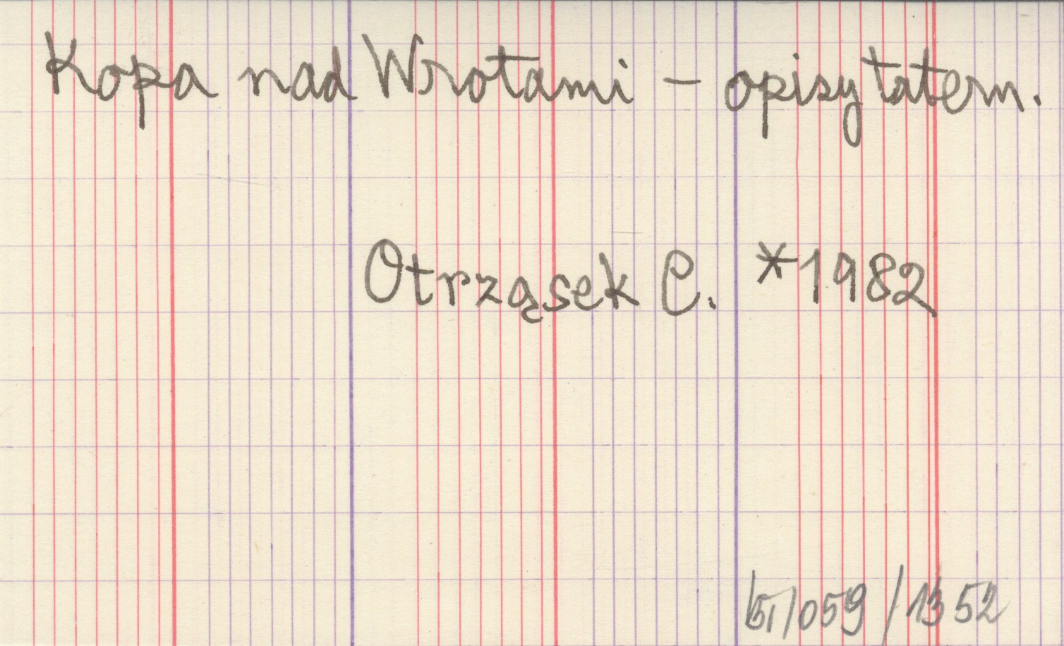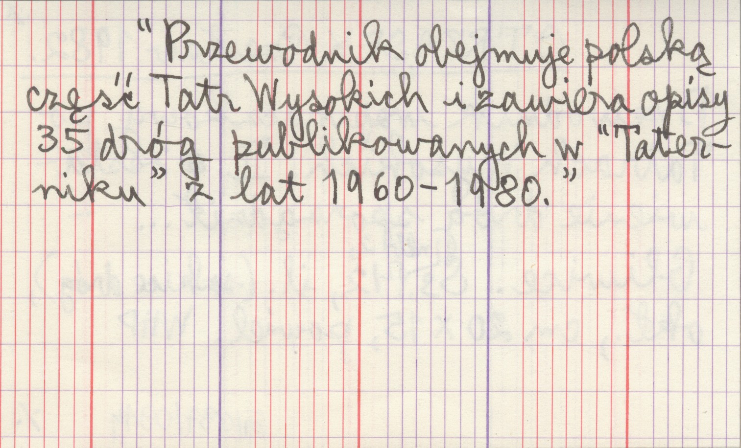 Gliwice , [2], 42 s., il., okł., 20x15 cm, powiel. Ilustracje: szkice dróg. "Przewodnik obejmuje polską część Tatr Wysokich i zawiera opisy 35 dróg publikowanych w "Taterniku" z lat 1960-1980".
